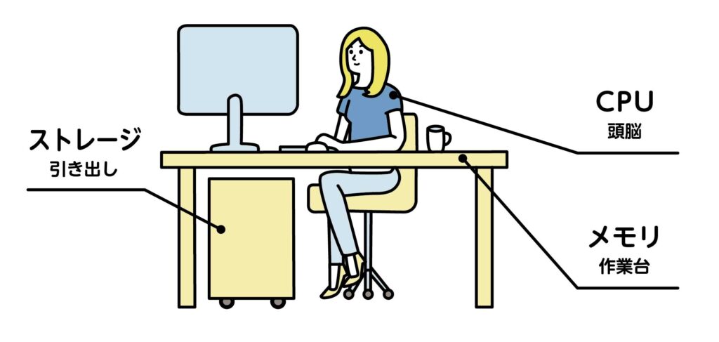 チップ、メモリ、ストレージなどの用語ですが、以下のイラストをイメージするとわかりやすいですよ。